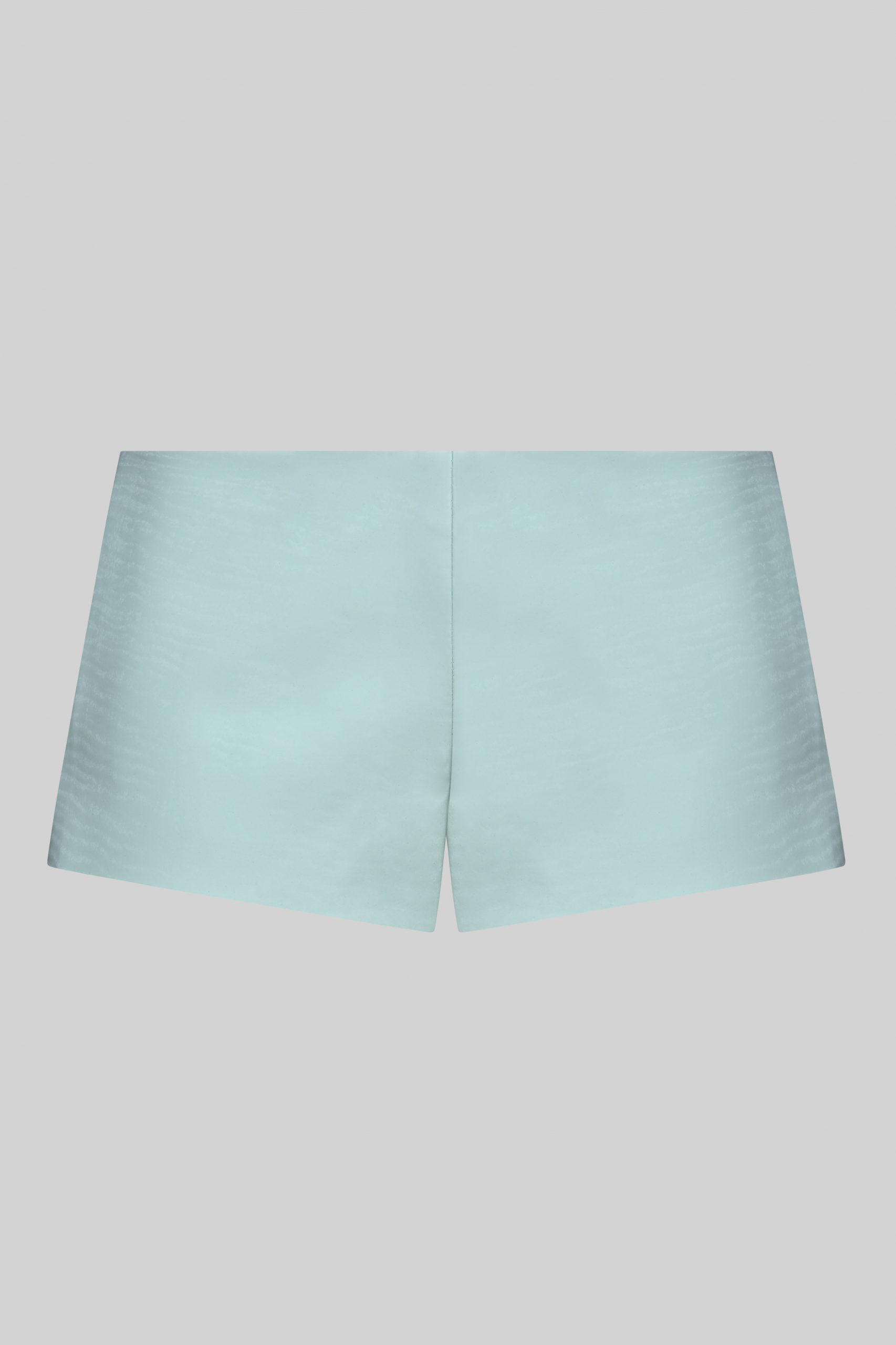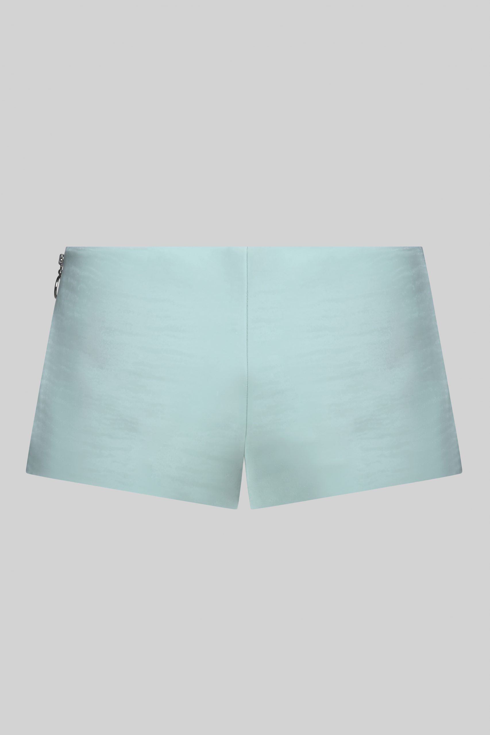 Mid-rise shorts in baby blue faux leather. Clean tailored construction. Elasticated waistband at back for comfort. Structured silhouette.