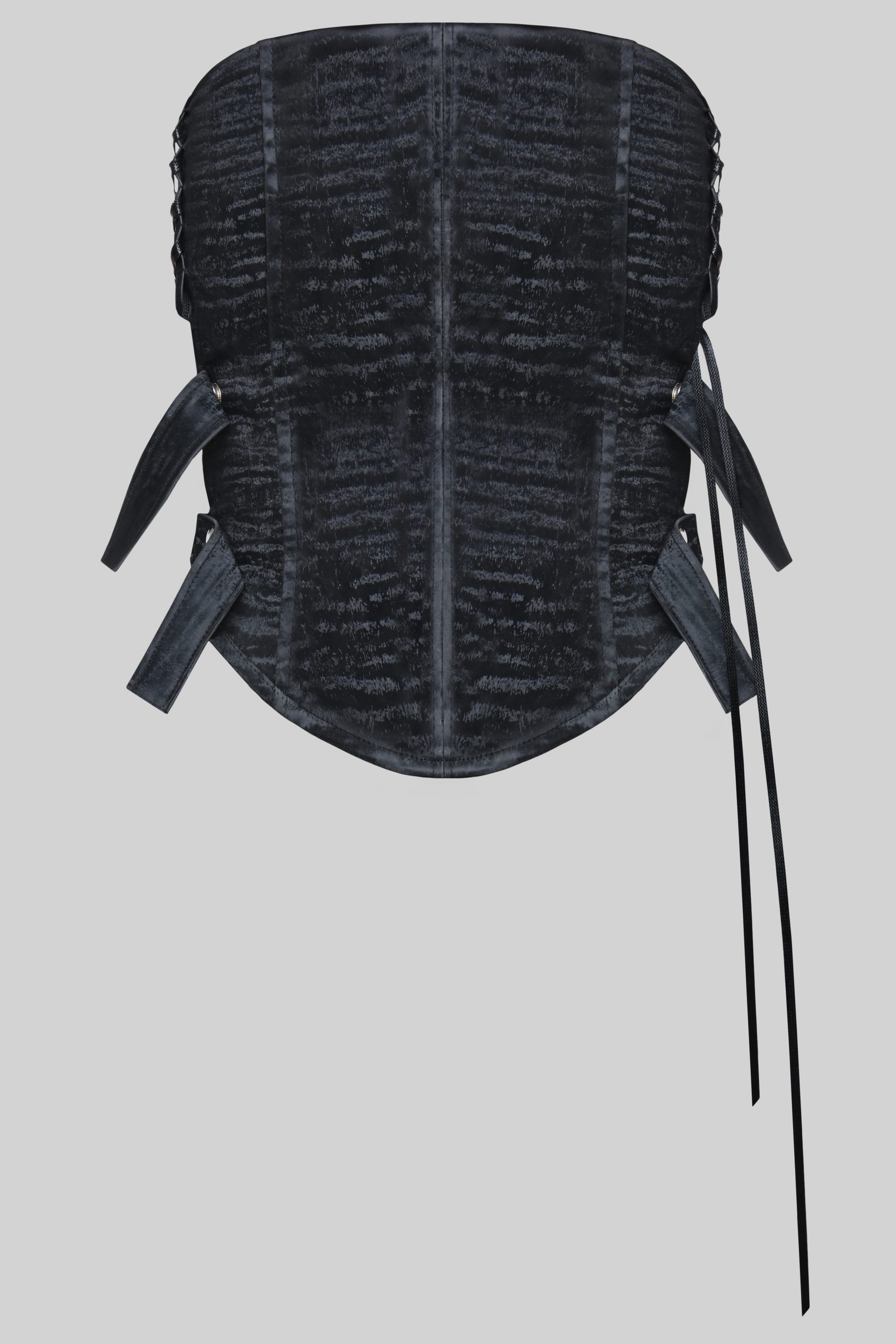 Structured corset top in black faux leather. Boned construction for enhanced shaping. Adjustable tie fastening. Cropped length. Clean sculptural silhouette.
