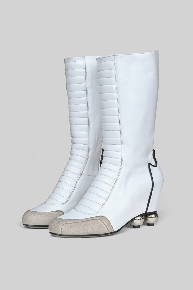 White calf leather, smooth grain. Rounded toe. Lace-up and Side zip fastening. Debossed logo to the front. Below-knee length. Sculptural rubber outsole. Futuristic puffed silhouette. extended tongue. 100mm Wedge heel with metal boll ending.